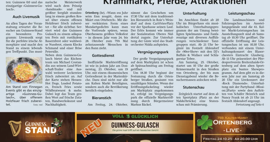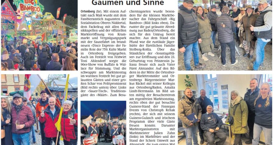 Seit 19 Jahren ist der Guinness-Stand von Christoph Rehak (Finnegan Events) ein fester und beliebter Bestandteil des Kalten Markts in Ortenberg. Finnegan Events ist ein Event- und Messedienstleister mit internationaler Erfahrung, der unter anderem irische Firmen bei Messeauftritten unterstützt.